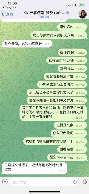 星空平台吞客户500块钱,跑路不给一直耗时间不给处理解决,一直找借口拖延时间,十天一直在拖延。