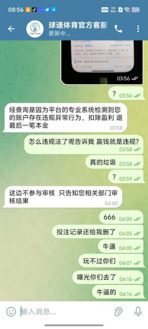空清 之前球速体育的广告打的满天飞,跟现在2028体育的广告模版一模一样。基本上就是换一个名字一个模版!而且球速体育之前的员工都跑去2028体育了!球速体育开始黑人了。我充值27000提款78000给我黑了 事情过了一个月也没人理!给大家看看球速体育的嘴脸,还要小心2028体育的嘴脸!明着黑赢钱就是套利之前输的几万块呢?问他违规什么也说不出来纯恶心人!被黑账号qq377566