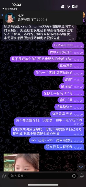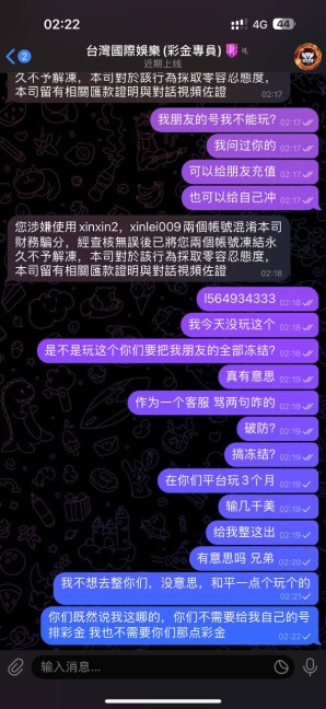 随风散 台湾国际 twgj77.com 工作人员横行霸道,你有钱充的时候你是爷你不玩的时候你就是孙子,我不针对谁也不说什么,玩电子的都知道,妈的借十个八个号来玩是不是很正常,况且我问过他们的工作人员的,可以给朋友上分,汇旺转,现在把号封了,封了就封了,没几个逼钱,就是感觉挺不爽的,兄弟们也要注意一下,现在的网赌平台还是要选择一个靠谱的台子去玩。