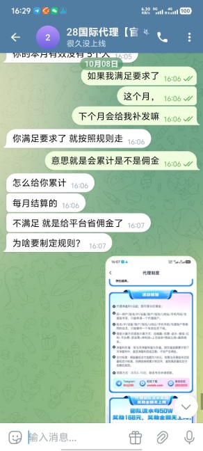 本月有效16个,23w亏损不发放,说不满足5个有效,然后补发666佣金,佣金不累计,平台光明正大说吃了,按照实际发放输了4个人头费算,本来玩家输了6w有个玩家出款8000应该出款的,说他玩28游戏犯规给他钱罚没了,我想的是罚没了,很多玩家出款1w左右无论电子还是彩票,必黑。