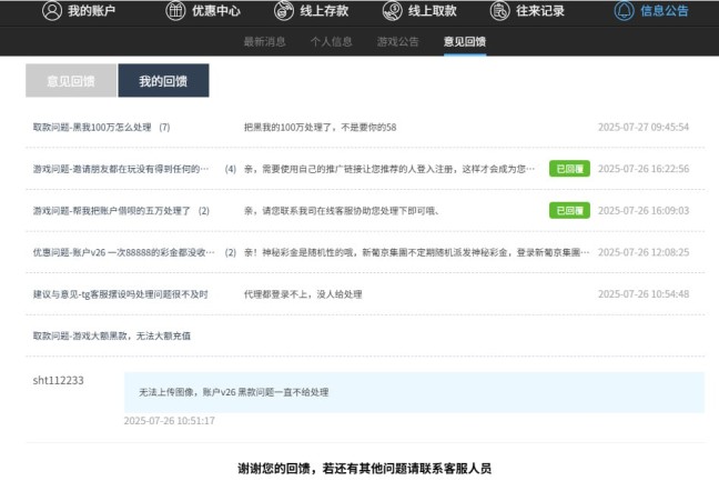 随风散 网址 3003.com 1992.com 狗平台TG: @www1966com 狗平台频道: @XPJ3003 我账户v26,流水打5亿,盈利到120万的时候平台说捕鱼账户风控,要检查注单,把账号的存款 提款 优惠活动全部封禁,下级账户也是无缘无故冻结,垃圾平台 整个代理线输300万左右,盈利还是黑款大家闭坑!!!