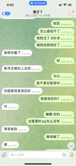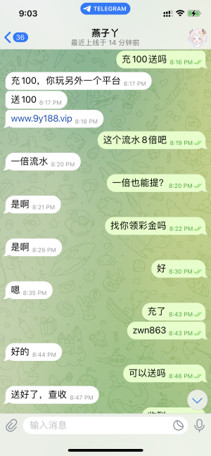zwn863 昨天一个代理加我,告诉我他们台子充300送158一杯水就能出款,我告诉他我没300,充100能送吗,他又给我发了一个台子。说充100送100,同样一杯水出,我就去充了100,打着打着流水刷够了,还剩150,然后我就想着提出来,结果这个台子一直卡出款,问客服客服也一直说在处理让我等待,也不封我号,客服也不理人,巨恶心,大家记得避雷9y娱乐城,充300送158的是木森体育,同样避雷一下。
