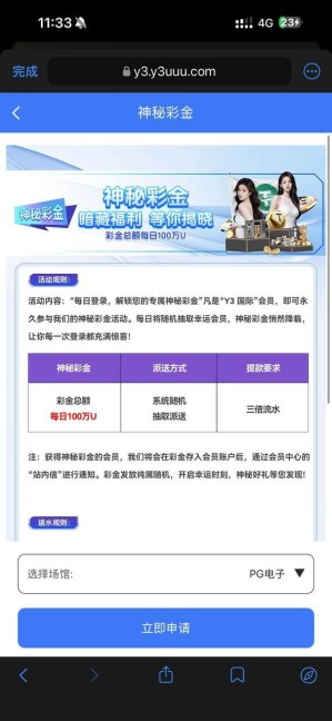 注册账号绑定u地址,优惠活动中找到神秘彩金自助申请,自动到选定游戏场馆中,目前秒到账,3倍流水提现!