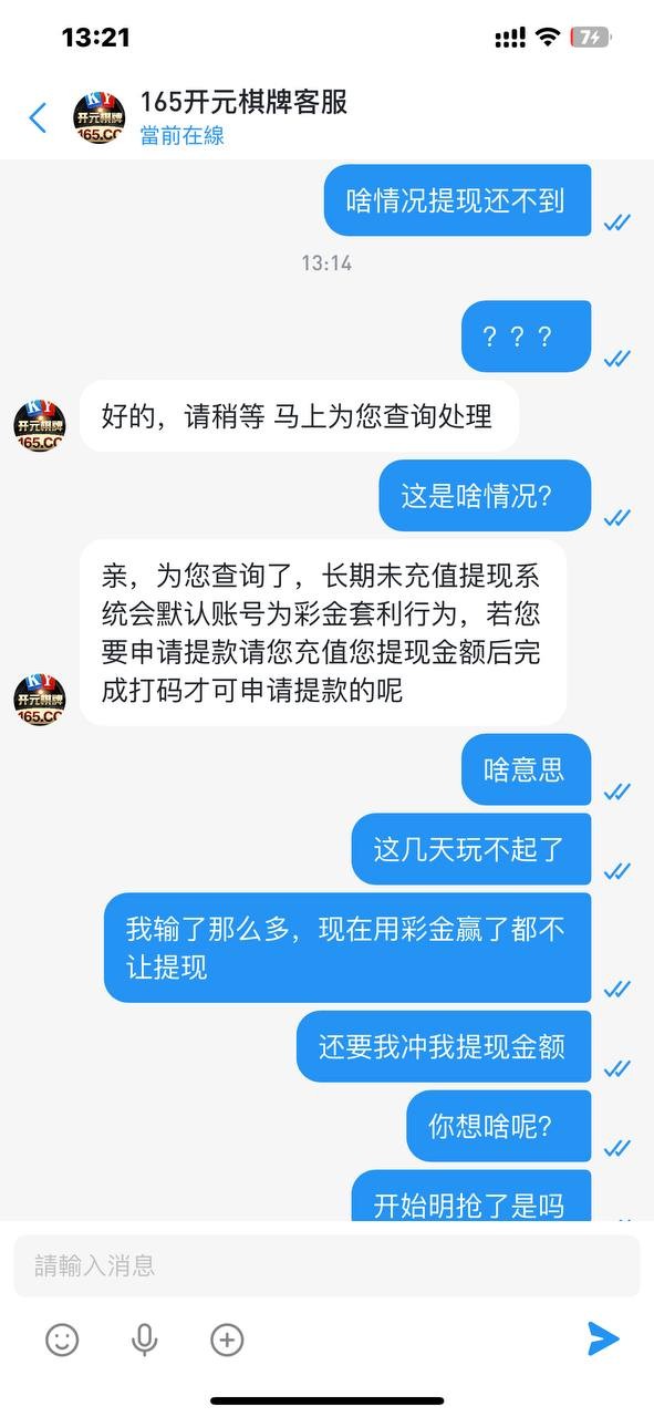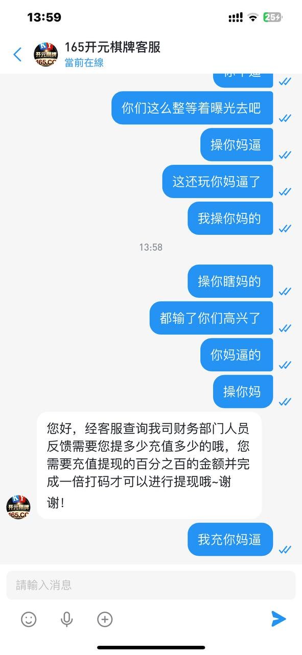 随风散 165开元棋牌,妥妥的黑平台,本人账号zhongyuan777在165开元棋牌v6会员,连续输了几个月,165开元棋牌的麻将糊了2,是盗版游戏,每次都是不管充多少一倍水都打不出来,今天彩金59打到900多都不给取款。找客服说什么取款多少需要充值多少还需要打流水,这个傻逼平台现一分钱都不敢充了,奉劝各位远离165开元棋牌,还有652开元棋牌都是一起的,你就没见过这么黑的台子。