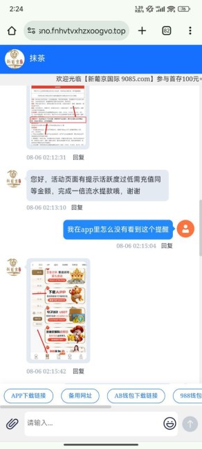 空清 新葡京国际 私自更改出款规则,且规则位置隐蔽,隐藏在每日红包弹窗里,新规规定最近一个月内需有充值记录否则不给出款。我最近一笔充值记录是在4.16,平台已经无法查询,最近一笔提现也是唯一一笔提现记录是在5.26。最近的出款申请全部被打回,联系客服说是账户活跃度不够,且需要充值余额同等金额,打同等流水才能进行正常提款。客服并截图平台新增规则,几百块都能卡的黑平台,有什么理由让玩家继续充值。希望大家擦亮眼睛远离该平台