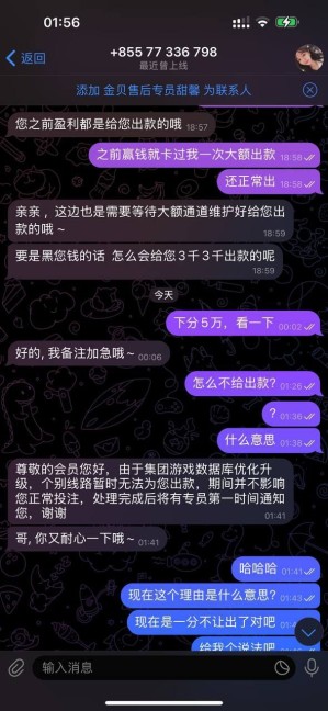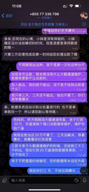 随风散 曝光一个杀猪台子: #金贝体育 这个台子新用户开始小额提款基本都正常 当你慢慢开始玩得大的时候就开始卡提款了 最开始是大额三方提款通道维护 接着就是游戏商数据更新 总之是编理由卡提款资金 前两次卡我大额出款的时候我账户余额分别是5万 还有10万 后面自己输完了以后 又马上恢复正常 他们汇旺收款账号是668899还有玩这个平台的哥们要注意了 别踩坑