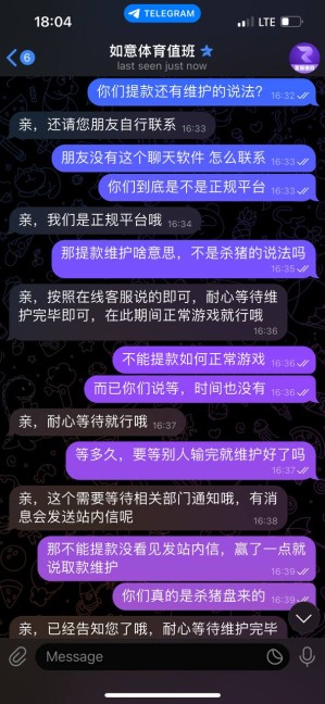空清 昨天存一万进去买了两场球赛,赢了两万多,提款说取款通道维护。看到这样说大概率知道肯定被黑了,果不其然从昨天到现在提款一直都被拒绝。问他们原因还是说在维护让等,继续玩 我还玩他妈的逼。 遇到这种杀猪盘也没办法,只能提醒大家注意了。 下面是如意体育招商飞机还有客服 @rytyzb888 @ryty999 我会一直关注这个平台,只要还存在或者改名了我就一直曝光。抵制杀猪,净化网络