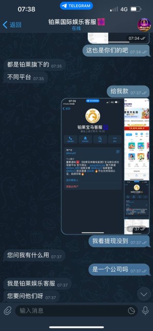 空清 还在玩铂莱宝马娱乐大家不要玩了,开始黑款了,说什么铂莱实体赌场担保,冲200玩电子爆了,提现直接改你的汇旺账号,我看半天没账,刚去问客服账号密码都改了进不去,大家不要在玩了,就他的纯诈骗台,亏了能一直玩,赚一点马上各种搞你不能提现,大家小心!!!