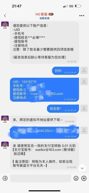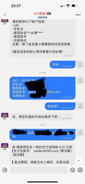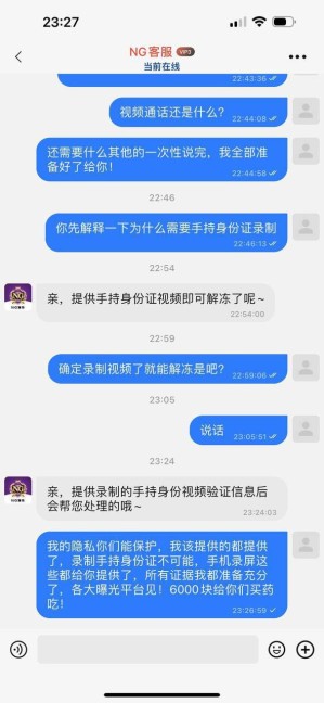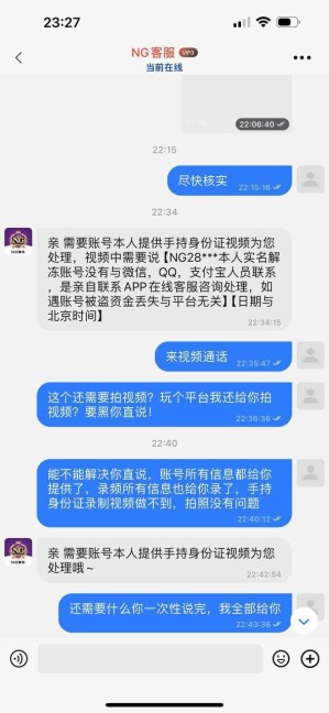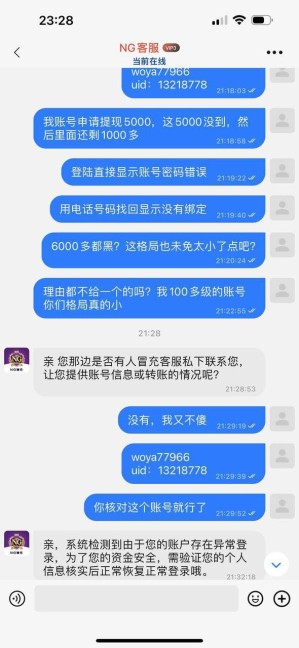 空清 NG-28平时玩一万一万的充值,账号都150级了,也输了不少钱,今天赢了点提款,里面6000的时候提款5000,然后留了1000多点,然后直接就被退出了,再登陆就显示账号密码错误,用手机号登陆显示本手机号没有绑定,去旺旺跟客服沟通的聊天详情都在图片和视频里,🆔也有录制进去,格局太小了,平时几万几万的输,现在赢几千就不给提现了,ng-28格局也太小了!绝对的实锤,本人描述句句属实,希望大家看清这种垃圾黑平台 NG28飞机🆔:@NGzgcs NG28旺旺🆔:330000 认准这两个所谓的官方🆔