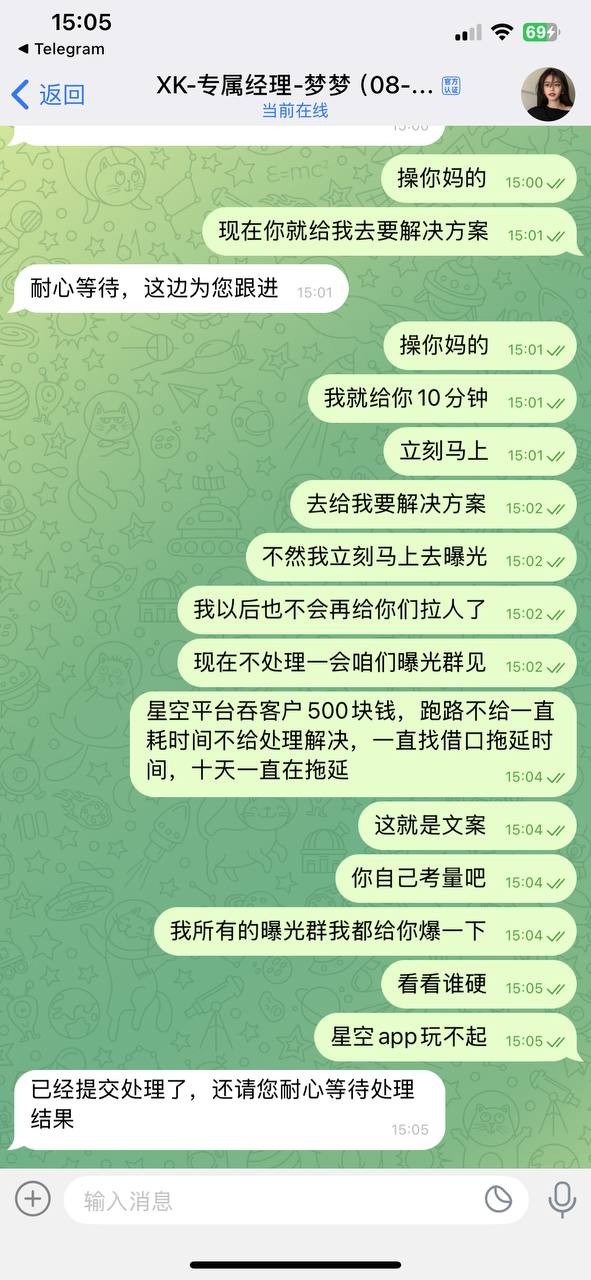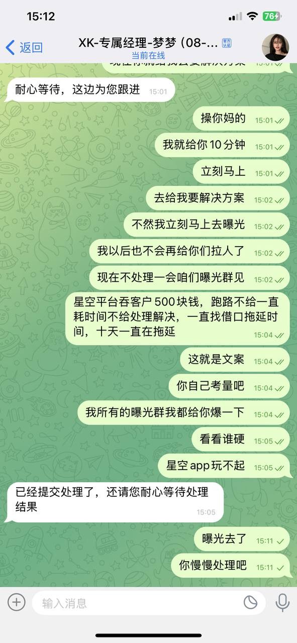 星空平台吞客户500块钱,跑路不给一直耗时间不给处理解决,一直找借口拖延时间,十天一直在拖延