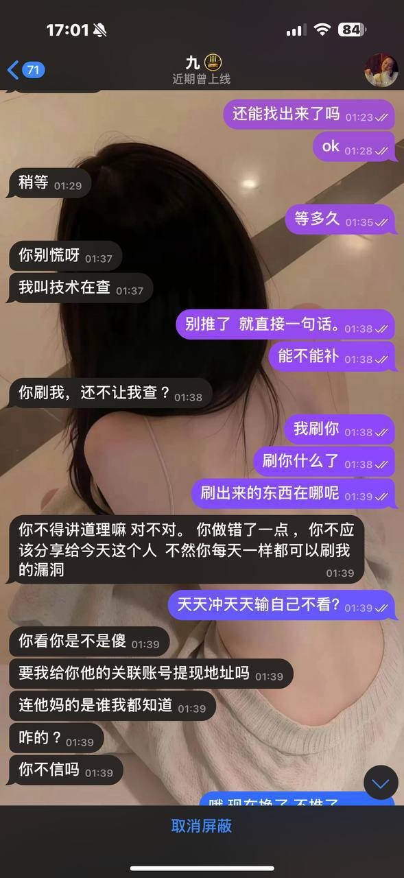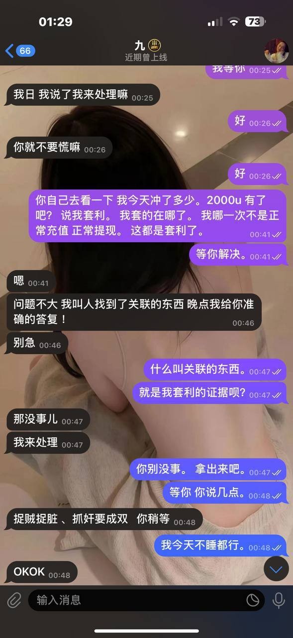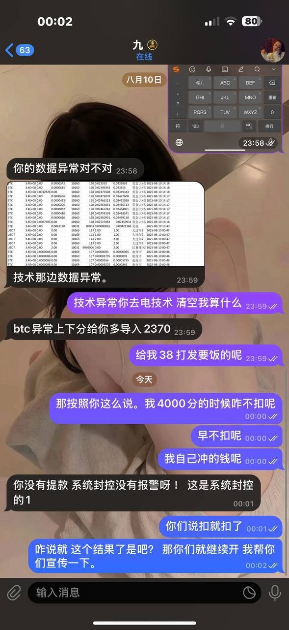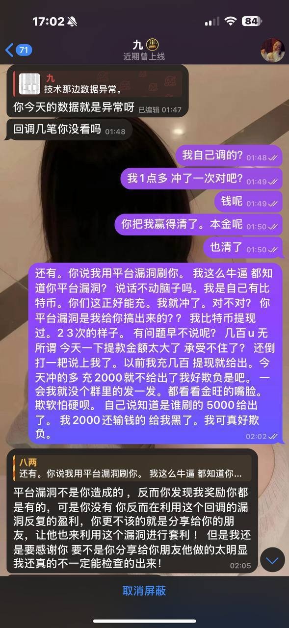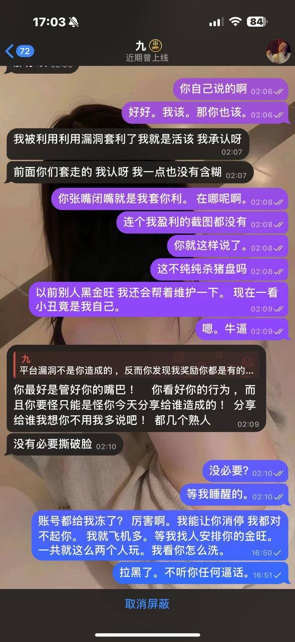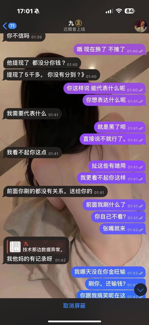 随风散 请问你说的套利证据是什么? 在哪里? 你以为一直推这个事就结束了吗? 杀猪盘不藏了吗。只能输 不能赢。 连自己冲的钱都被清空。说的话好像很大方的样子 以前套的就套了。我再金旺是输是赢你是一眼不看? 哪个套利的 有4千余额不提。提2千。 崩盘了。 摊牌了。不装了? 直接拿我补窟窿了? 大家注意吧。现在金旺已经快要开不下去了。谁充值就杀谁。全都是填坑的。出款地址只有 1000多u了。窟窿太大补不上了。 黑了我2000,甚至本金都不还 直接冻结账号了。还威胁我管住自己的嘴? 你不想撕破脸? 我无所谓。 你不是很牛逼吗威胁我吗? 不怕你。 必须让大家看看你的嘴脸。