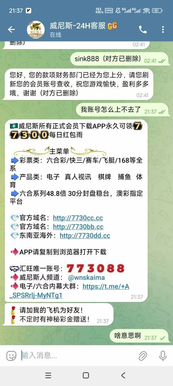 空清 在7月20号左右玩 一开始玩的时候看群里面16万多成员,威尼斯综合群里面每天都很热闹,以为是一个靠谱平台,就联系客服下载了APP,进行娱乐新澳门六合彩一开始玩充值USDT,基本上天天都有充值玩,我就每天和朋友分析下什么特码,VIP等级是VIP7。玩了大概半个月前后输了10几万块钱,8月12号中奖6万,体现正常,越让我放松了警惕,感觉这个平台相当的靠谱!直到8月15号哪天下午4-5点左右我下了将近1万元左右的特码,我就去忙别的事情去了,到晚上9点35分开奖的时候,我朋友告诉我中奖,他的APP提示中奖了,我就登录我的APP直接账号封禁,登录不上去,我朋友账号正常可以登录上去,我就很奇怪去联系客服问一下怎么回事,客户看到我的账号后,就不回消息,立马把我从16万人员群里面踢了出去,我要另外朋友去群里面问怎么回事,结果进群说到我这个事情立马踢出群,玩了差不多一个月在里面输了钱,一中奖就封号,最近几天我朋友他们都不敢在威尼斯app下注了,怕被黑,我身上4-5个人都在玩威尼斯人,而且都是我推荐过来的,没想到威尼斯格局只有那么一点大,10万不到的奖金都派发不了,直接封禁账号!下面只是一部分截图,充值的截图太多了。希望威尼斯管理人员看到帮我处理这件事情,这件事情没有解决我朋友他们都不敢玩!不要以小失大。 —————————
