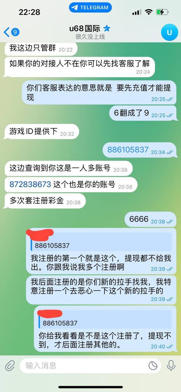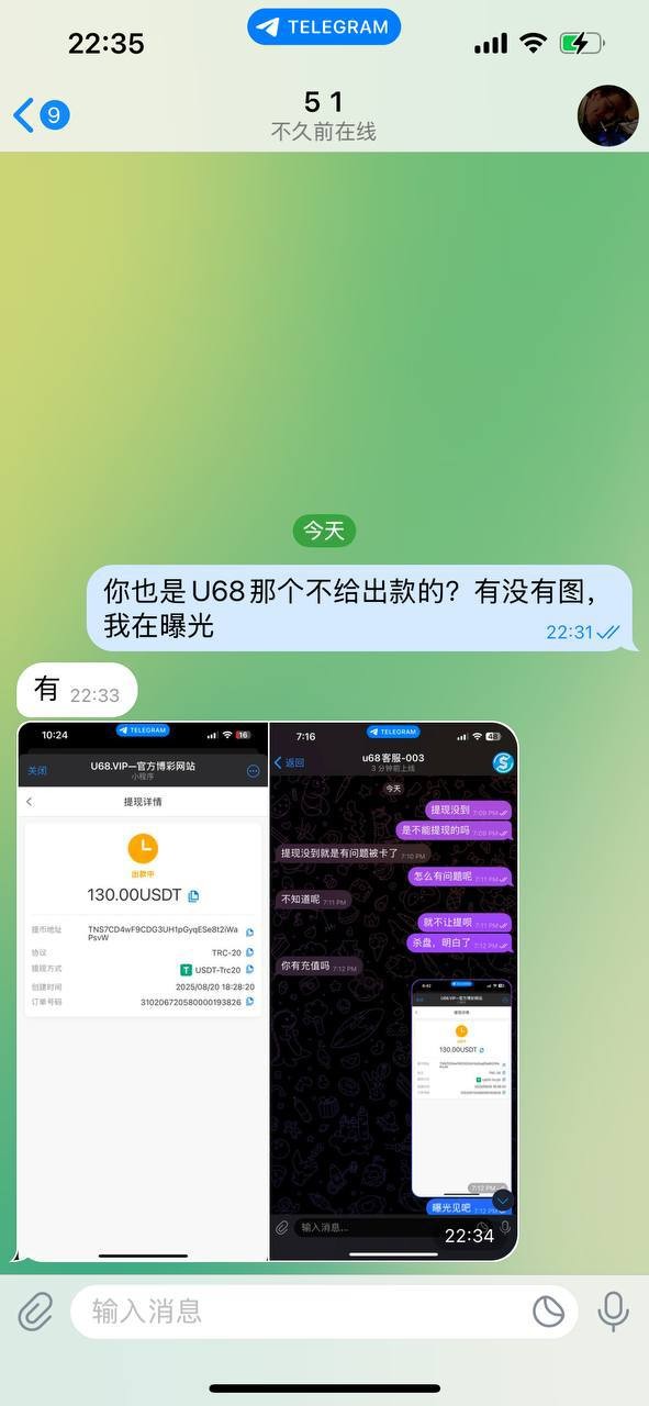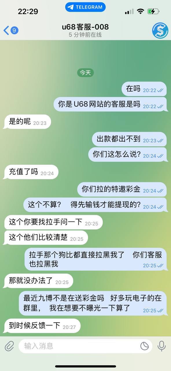 空清 曝光一下假台子。希望各位赌狗们别上大逼当了。我们可以输钱,可以挂逼,但是一定不能被骗。 下面这个U68的台子就是不给出款的了。你赢钱了必须先充值才有可能给你出款出款需要联系拉手。 我猜这是一个主做杀猪的台子,跟拉手合作的。701提现300没到账去问网站的客服,他让我找拉手,拉手直接拉黑我,紧跟着网站的飞机客服也紧跟着拉黑我。