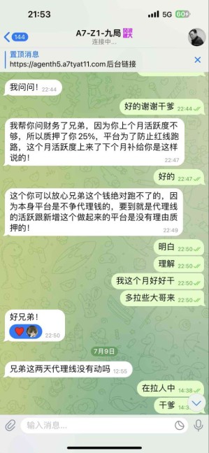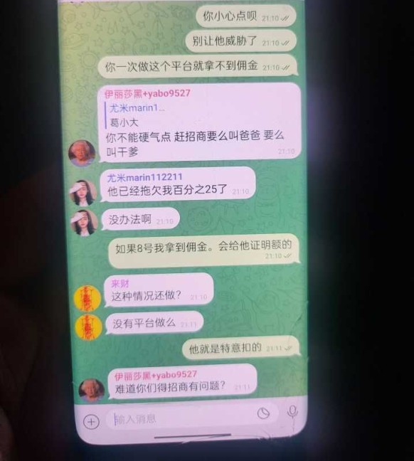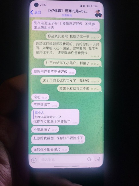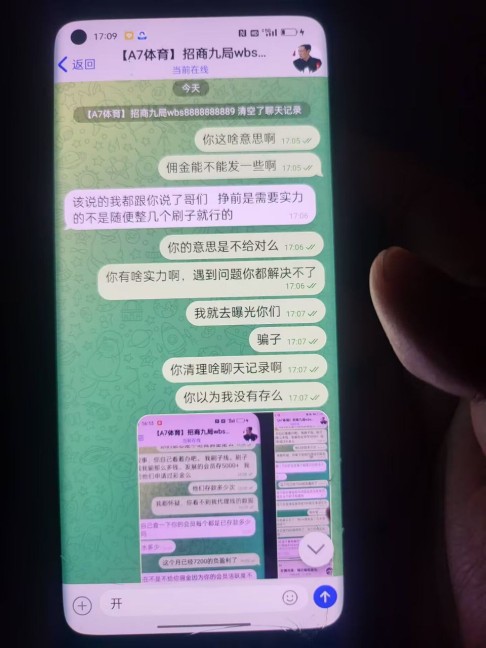 随风散 大家不要做。大家不要做。没开线的时候天天求着你,开线了天天墨迹你发展会员。发佣金的时候直接消失。几天后告诉你批量刷子。不符合要求。让继续发展说下个月一起发。群里有几个会员就是这样被恶意克扣25佣金的,结果次月也没发。大家小心点千万不要去A7开线。找各种理由克扣佣金 以下是聊天记录。 这种招商赚你负盈利回头就骂你。各种理由黑佣金