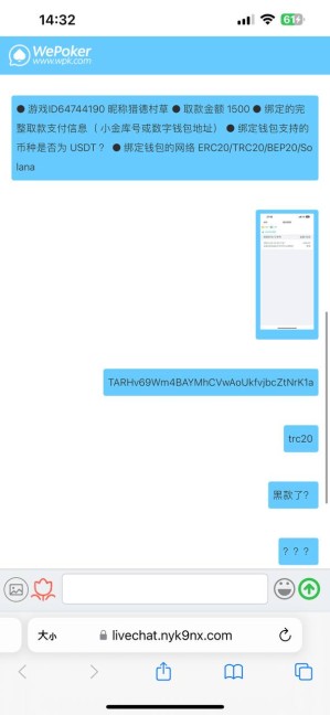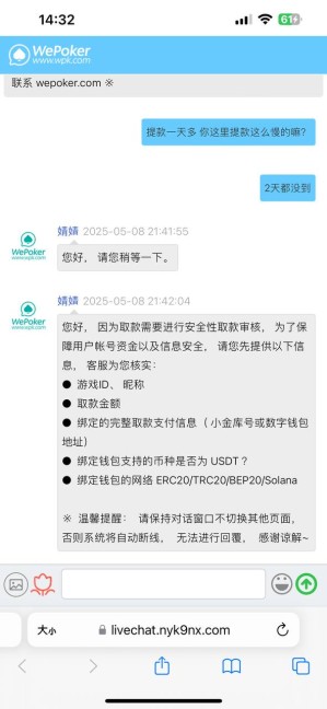 微扑克wepoker 大厅。5月6号充值打了一下德州牛牛赢了1500提款2天没到,后来去找客服,客户让我提交资料,提交资料完成之后,第二天我连提款信息都看不到了。直接黑款,客服也不理会了。