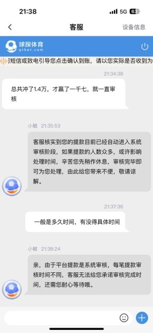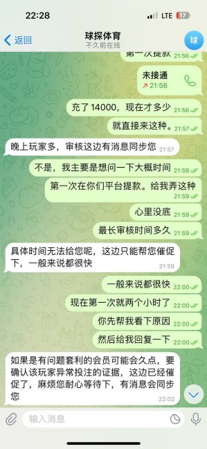 随风散 球探体育,亚博系包网,属于三代吧。第一次在他们平台娱乐游戏,进去玩体育下注2000,然后比赛结束以后赢了之后显示投注失败。把钱退回了。后面就打百家乐,陆续充值15800,把本金打回来赢了100块钱,然后就想着提8000本金出来,结果从提款到现在6个小时一直在审核中。问在线客服,客服回答,出款问题她也不清楚。然后就一直回复系统审核以后会出款。就一直说耐心等待。后面联系上了飞机推广代理的人,他说帮我跟进一下,一般这种情况都是套利审核。我就想问一下,我充值15800,余额15900,我拿大炮打蚊子?套你100块钱?刚刚登陆看下提款状态,显示账号冻结,登陆不上了。去问客服还装摸做样说查询,让等待。属实恶心人,纯纯的黑平台。属实没有一点格局。附上平台链接以及客服对话截图和推广飞机号。大家避坑吧。
