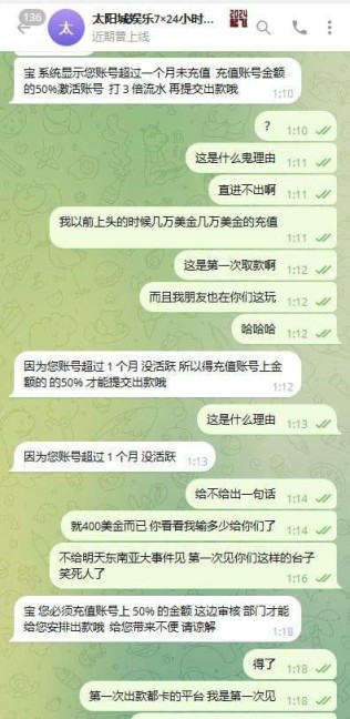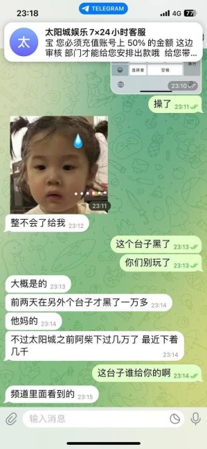 空清 此事发生在昨晚,本来下班没事做了,躺在床上没事做。想着打打转转娱乐一下,台子是朋友推荐的,所有就没想那么多,本人也是从事灰色产业的人员 但是万万没想到昨天运气好战胜了狗庄小赢400美金,想着时间也不早了,就提现了400美金,准备享受90分钟的爱情,在我选完了妹妹后发现并没有到账,我就去问客服了,不说别的之前在启航玩都是几万的输我什么都没说,汇旺娱乐也是输了不少,大大小小的台子加起来输了总计100多万U吧,昨晚你们客服的回答也是属实把我整笑了,后台都不会看的傻逼客服我真是谢谢你,第一次出款400都卡的台子我真是不想说什么了,你们老板也是个人才,招了你这么一个客服,损失了我这么一个大客户,我自己都想笑,送钱给你们的机会都把握不住简直笑死人了